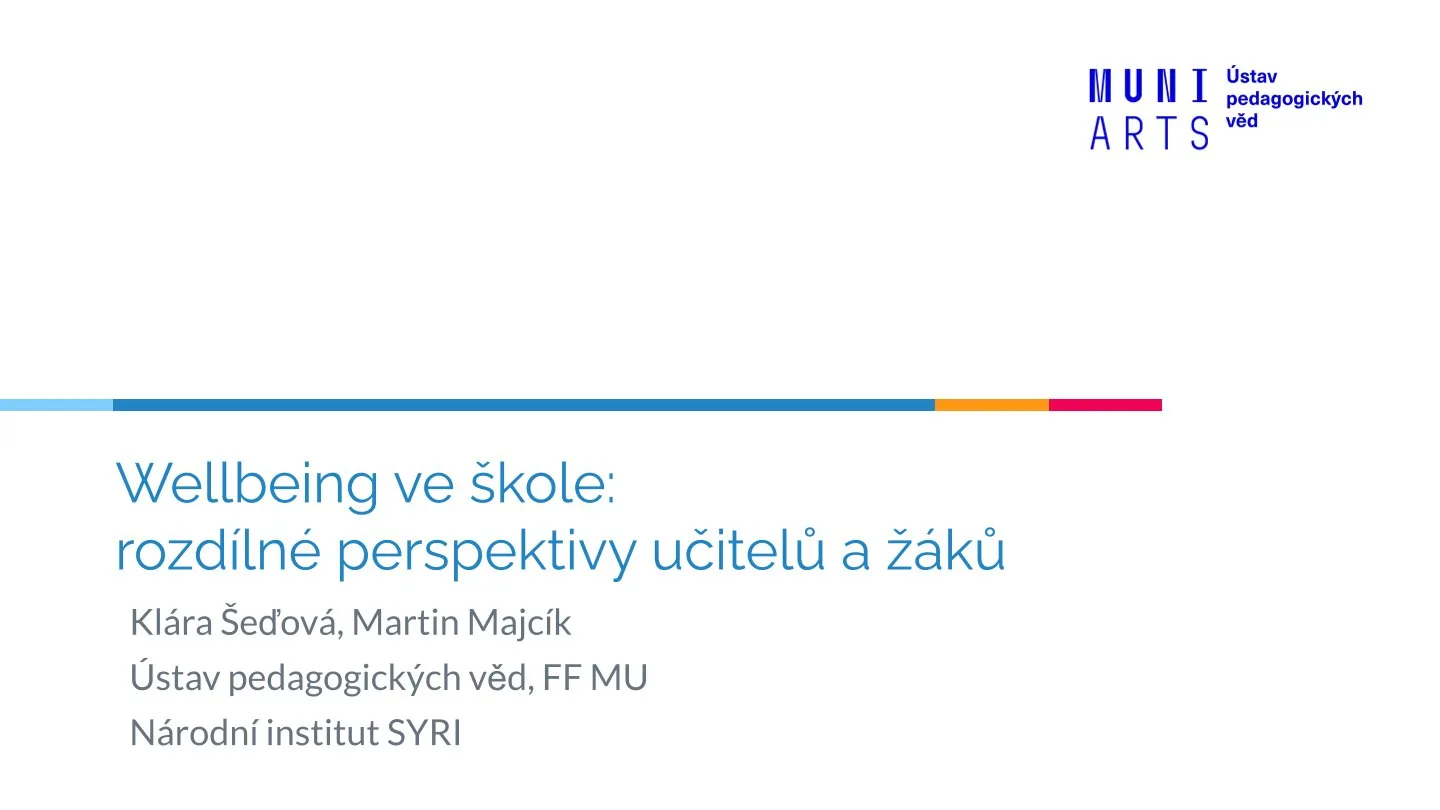 Jak pojmu wellbeing rozumí pedagogové? Na to nám odpověděli Klára Šeďová z Filozofické fakultu MU a Martin Majcík z Ústavu pedagogických věd MU. Celou jejich prezentaci si můžete prohlédnout ZDE.